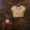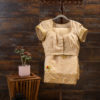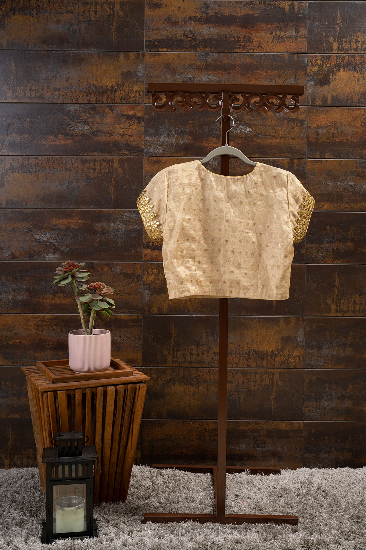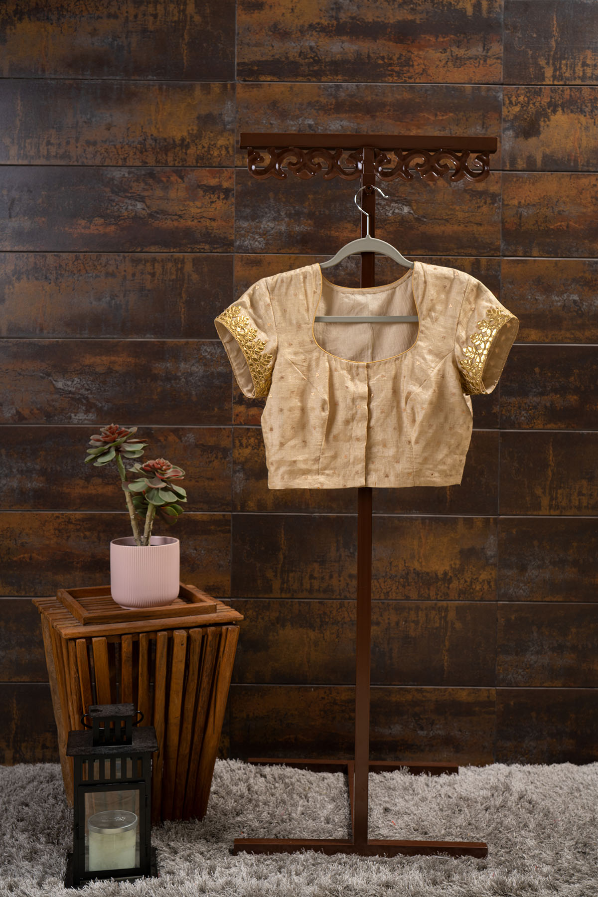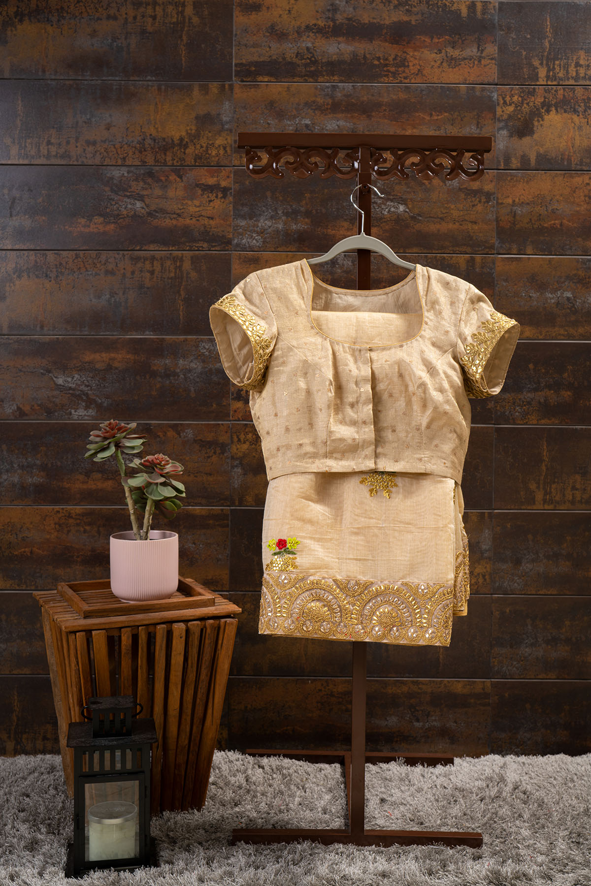 Beize Linen Silk saree in embroidered flowers and gold zari blouse with embedded sequin work all over and Gota border beize blouse.
