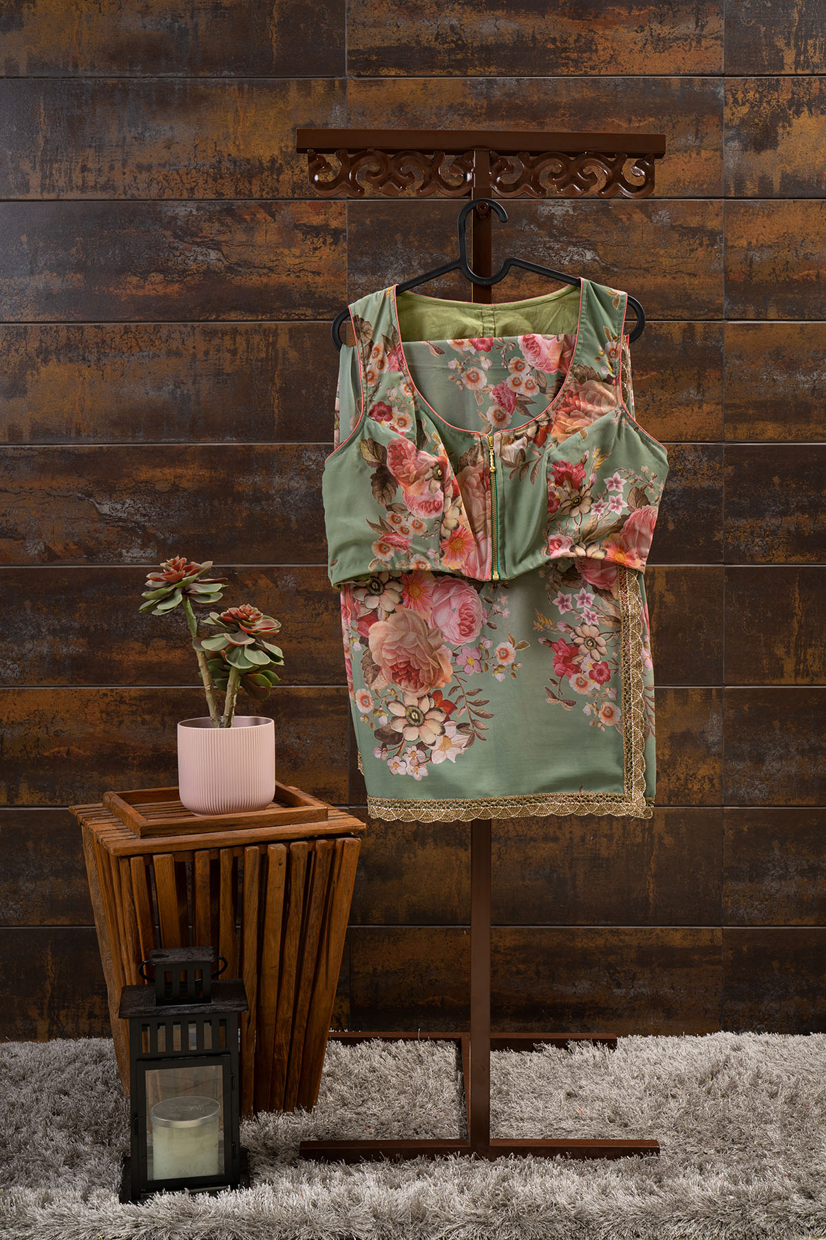 Green saree in Georgette floral digital print and antique Lacework with stitched Georgette Blouse.