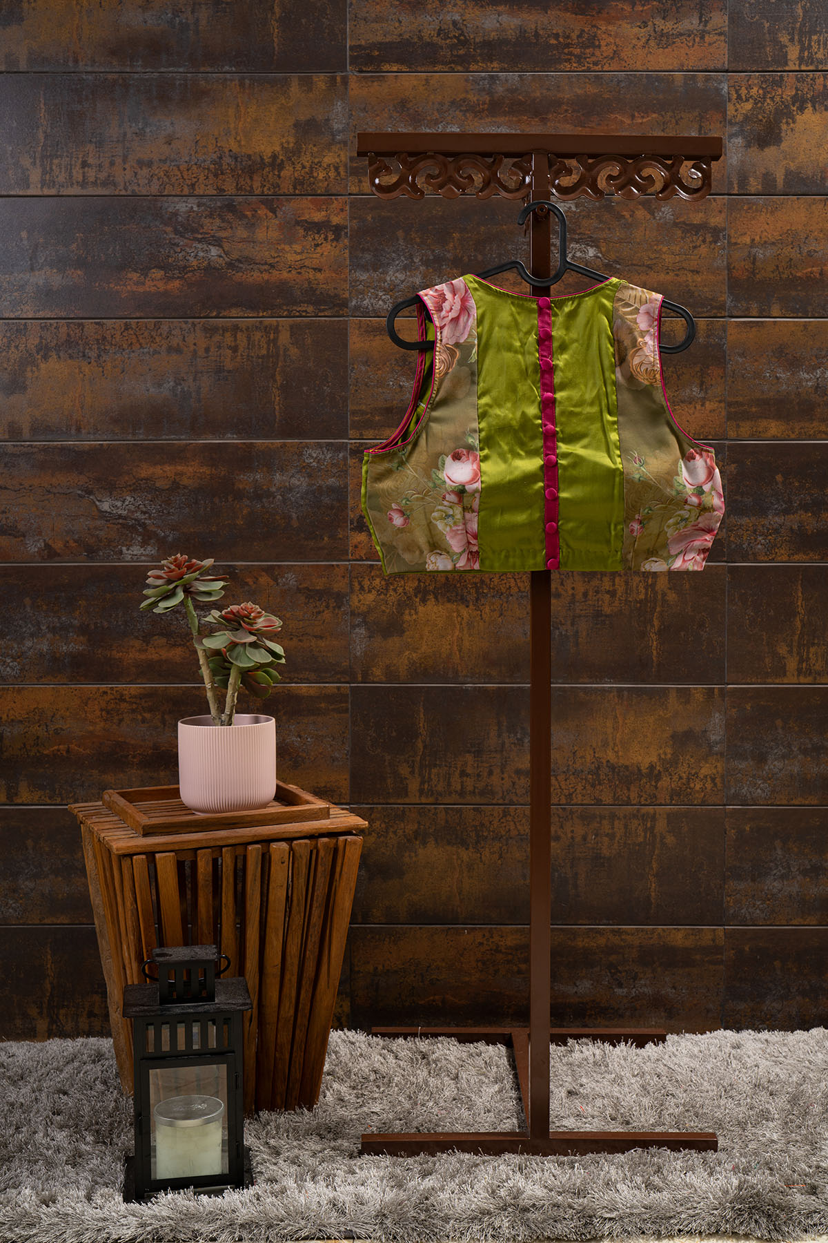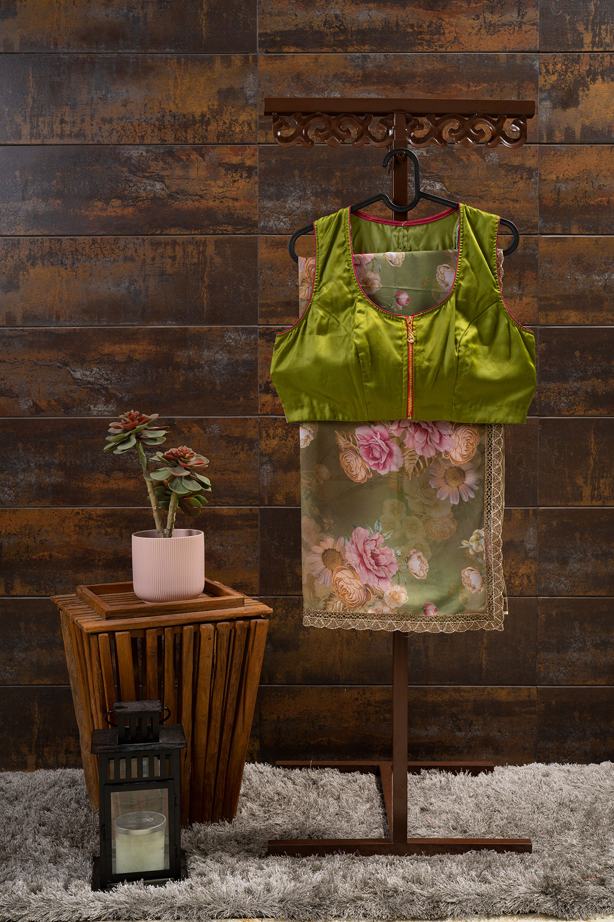 Green saree in Georgette floral digital print and antique Lacework with stitched silk and Georgette Blouse.