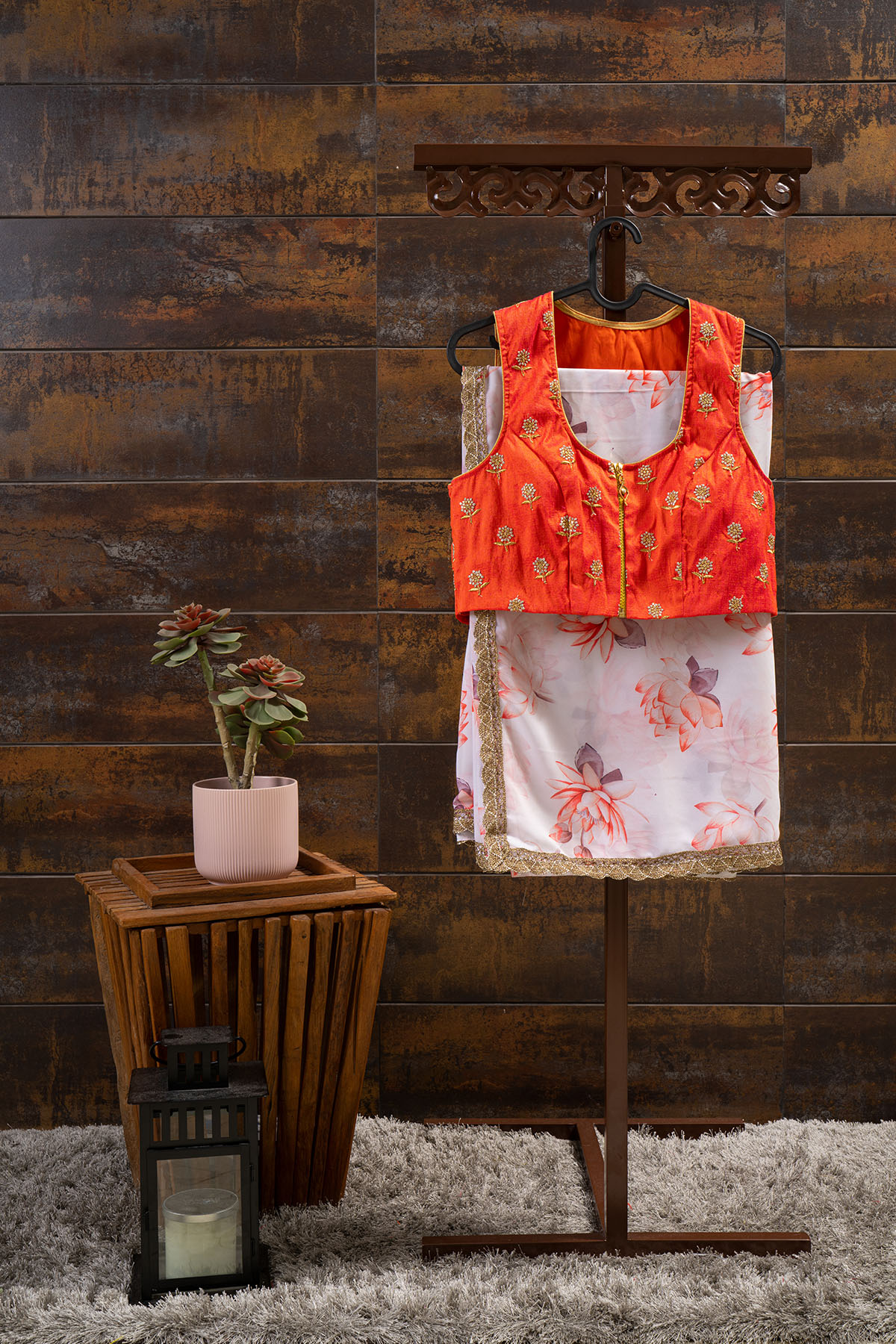 Cream Saree in Georgette floral digital print and antique Lacework with stitched orange embroidered raw silk Blouse