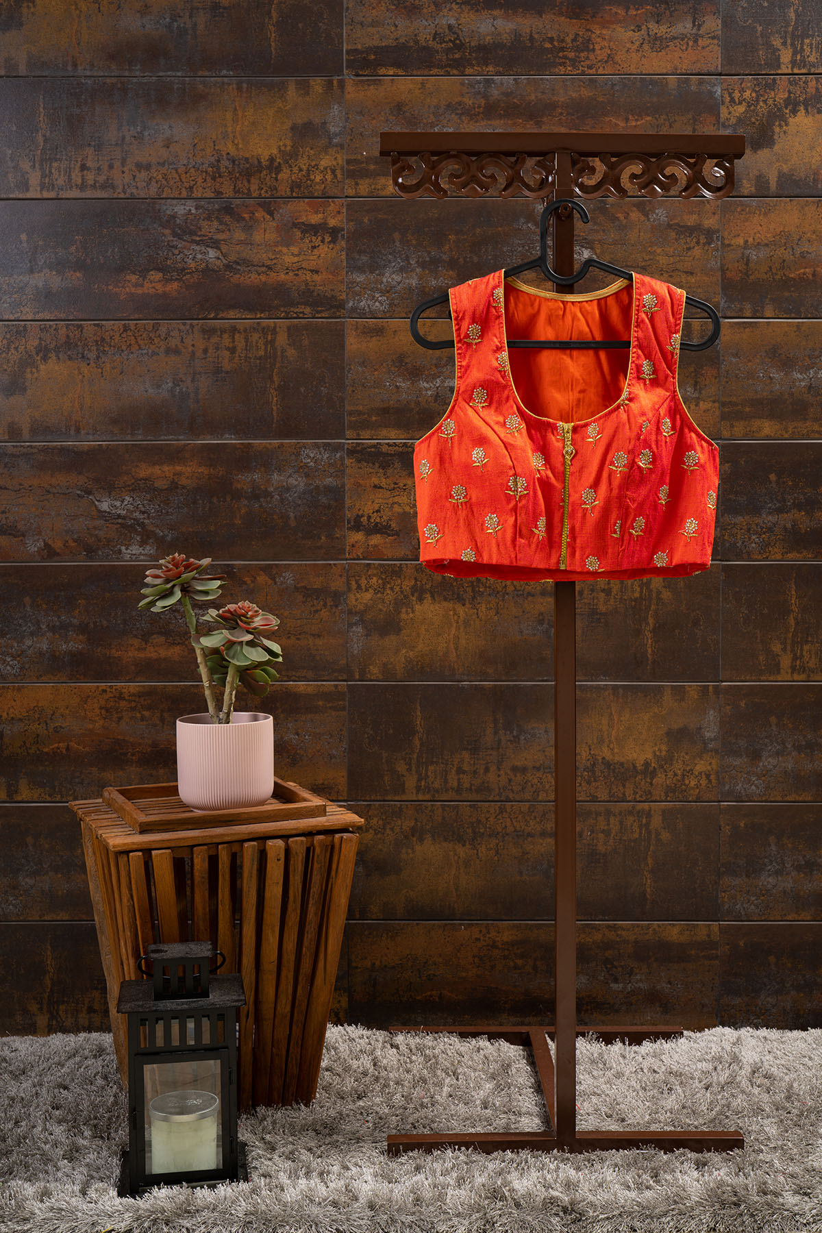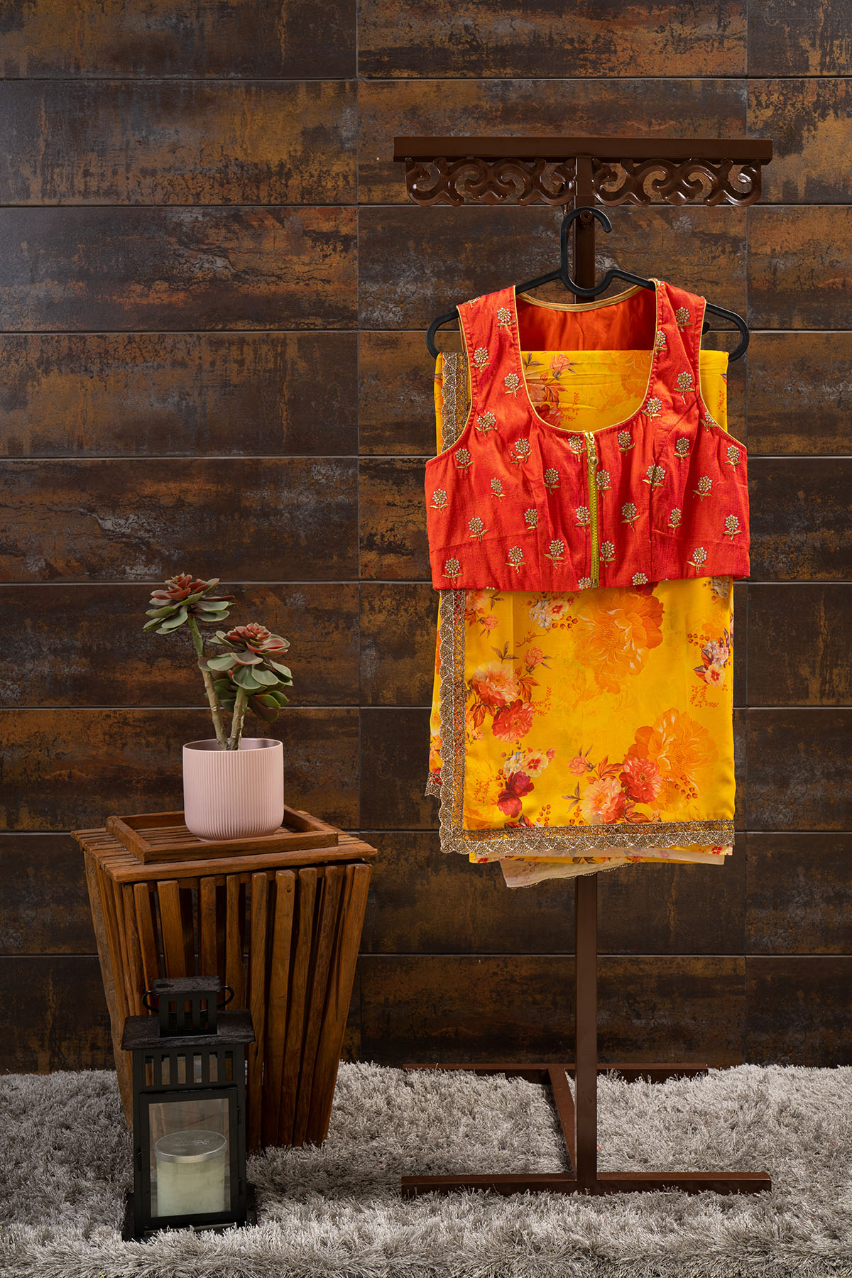 Yellow saree in Georgette floral digital print and antique Lacework with stitched orange embroidered raw silk Blouse.
