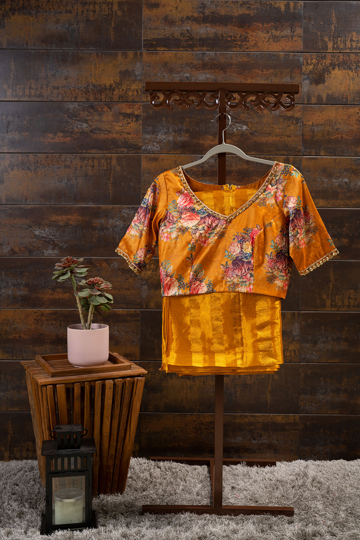 Gold tissue silk saree in Gota border with floral digital printed and handmade sequin border gold blouse.